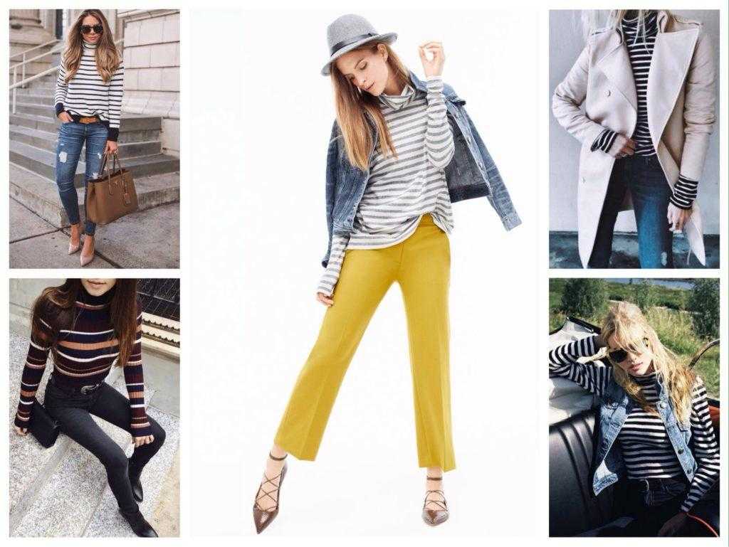 Горизонтальная полоска в морском стиле всегда востребована. Потрясающий, свежий принт, который не остается в стороне в любую погоду, добрался и до водолазок. Но данный элемент одежды не должен обтягивать тело и визуально деформировать фигуру. Но, если правильно выбрать материал и покрой, в соответствии с типом фигуры, ростом и прочими индивидуальными особенностями, можно получить стильный образ. Такая модель подходит для ношения с джинсами, черными или темно-синими узкими брюками, юбкой, как элемент многослойных образов.
