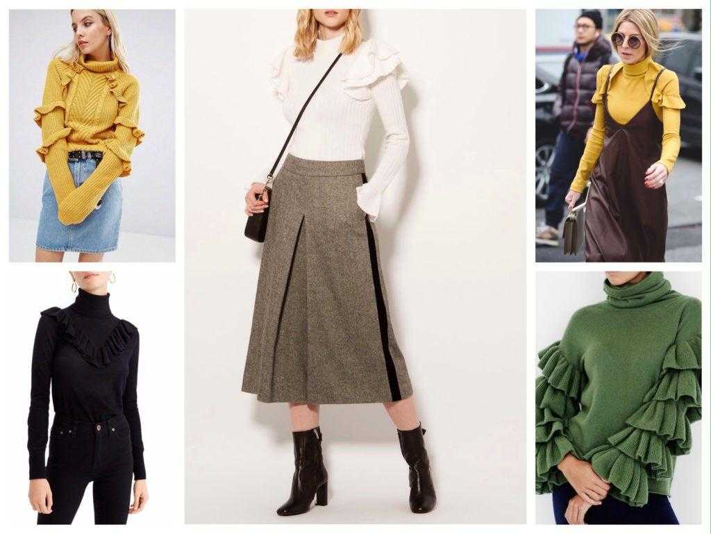 В новом сезоне водолазка с кружевом привлекает к себе внимание элементами жабо, рюш на рукавах или по нижнему краю