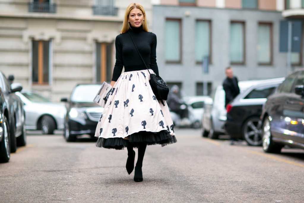 Лаконичность такого верха как бы намекает, что он не прочь смелого низа с необычным принтом. Если в вашем гардеробе залежалась юбка с креативной расцветкой, просто попробуйте скомбинировать ее с черной водолазкой и подарить новую стильную жизнь.