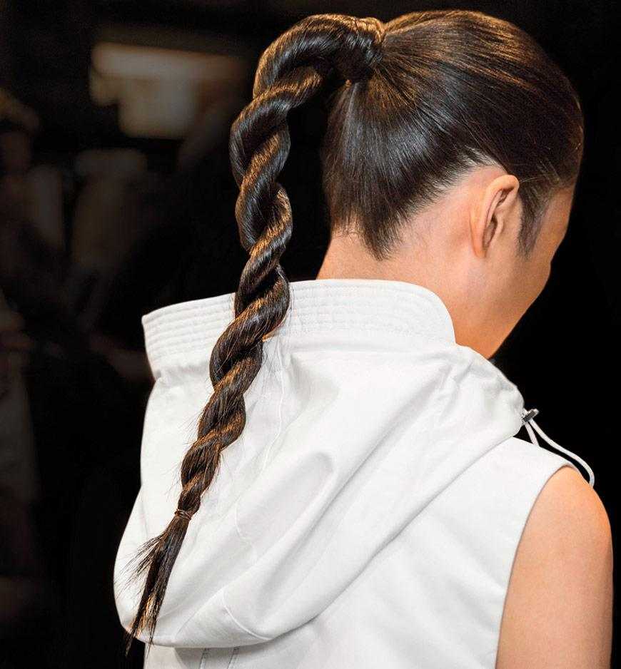 Канатная коса. Основа для этой красивой и необычной прически – все тот же хвост. Его нужно сделать высоко, пряди поделить надвое, закрутить жгутиками. Затем они переплетаются друг с другом и фиксируются – получается эффектный канат.