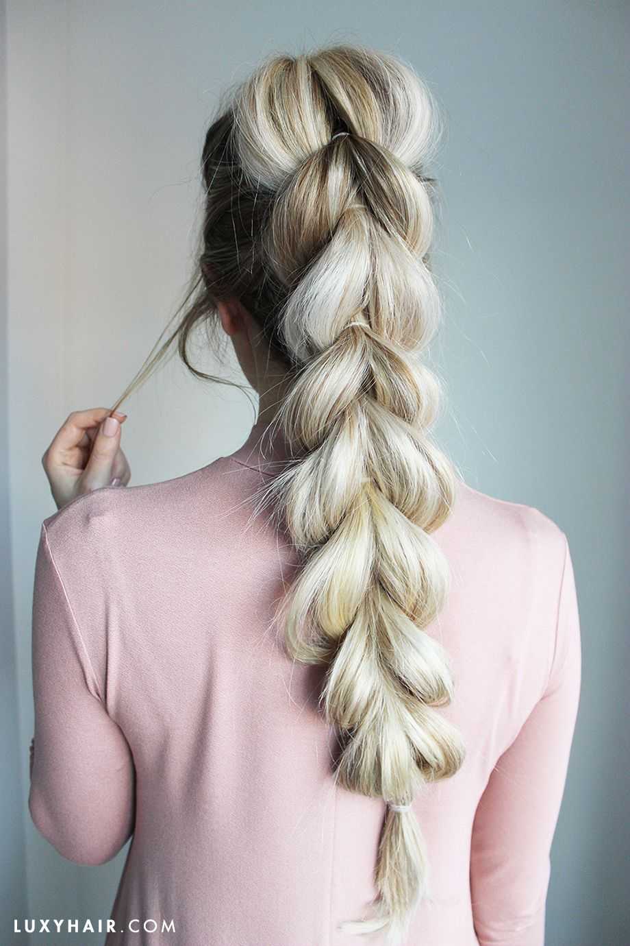 - Через соединенные волосы аккуратно продеть полученный хвост, как показано на фото. Приступить к плетению нетугой косы.
