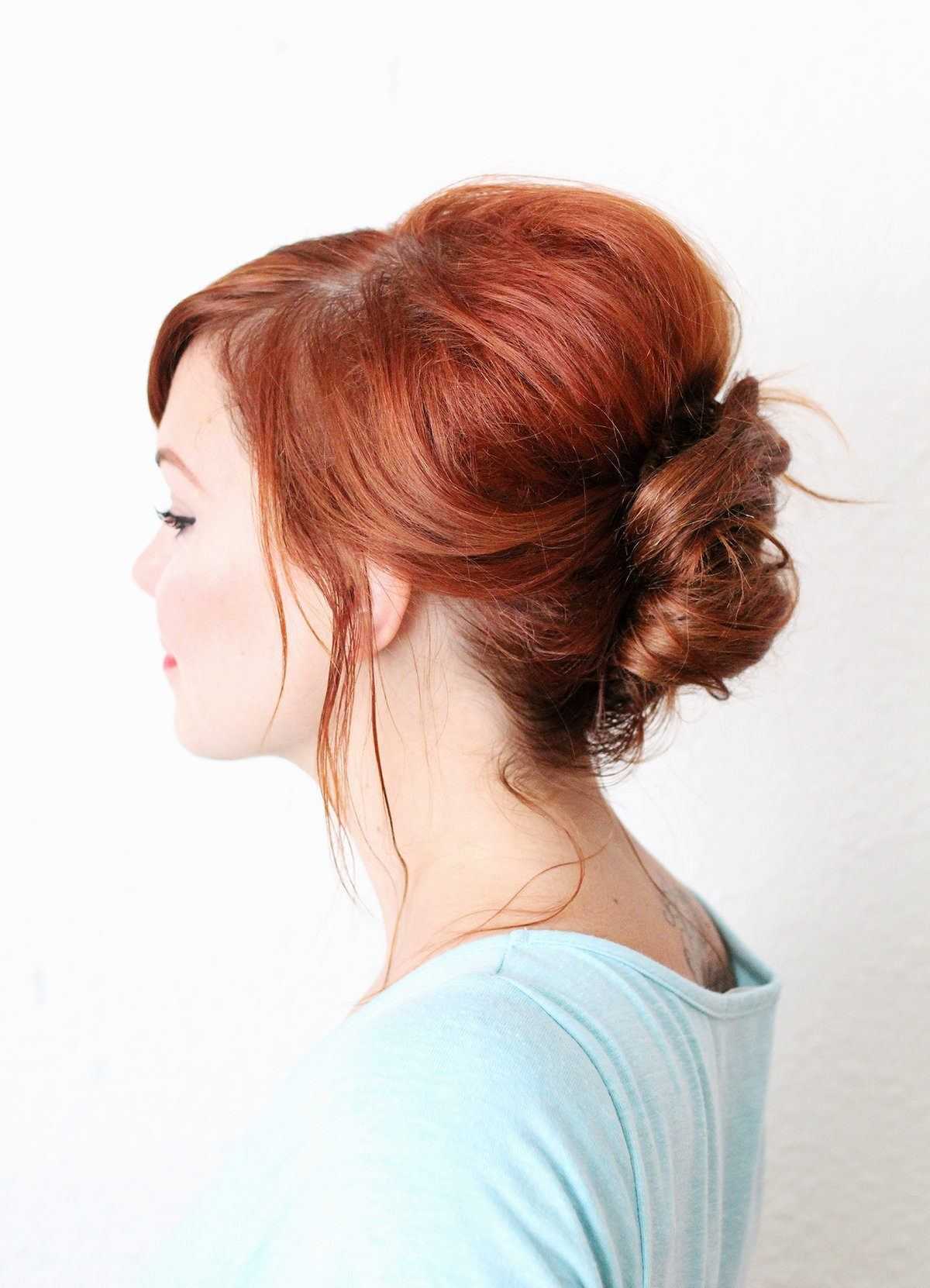 Пучок с бубликом можно выполнить всего за пять минут, при этом совершенно не обязательно обладать парикмахерскими навыками. Создание такой прически на средние волосы начинается с хвоста. Через него нужно пропустить бублик и по нему равномерно распределить волосы. Зафиксировать их резинкой. Оставшиеся концы прядей спрятать под пучок. Готовую прическу зафиксировать невидимками или шпильками.