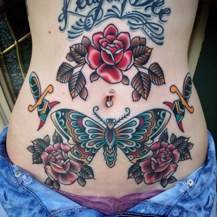 Одним из популярных эскизов, выбираемых девушками для татуировки в нижней части живота, являются вариации изображений бабочек: