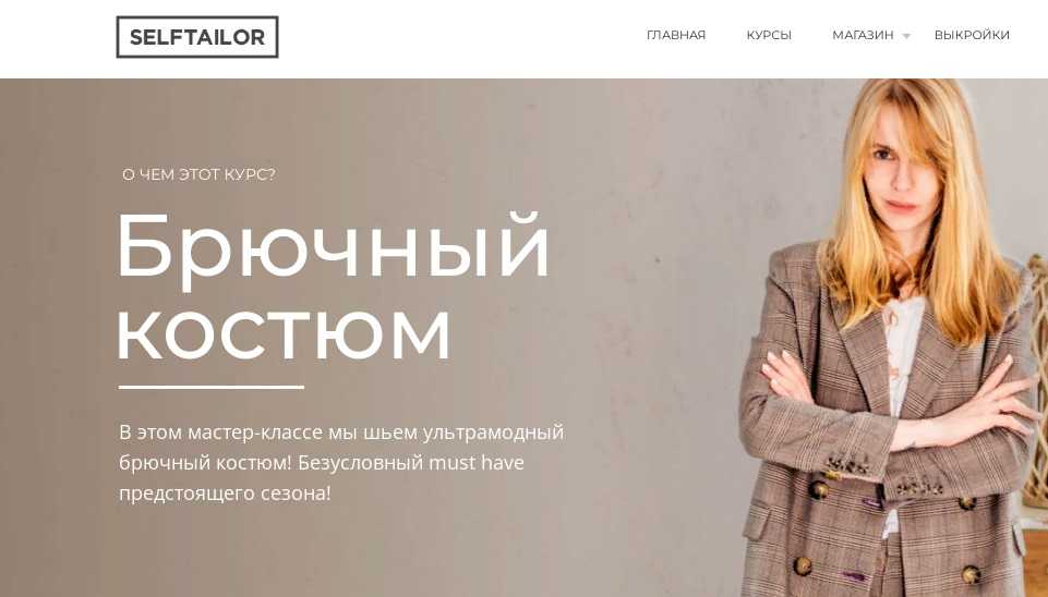 Хотите иметь стильный брючный костюм? Воплотить идею предлагает мастер-класс швейного клуба SelfTailor. Преподаватель и автор курса портной с 15-летним стажем. Весь процесс создания изделия расписан по шагам. На сайте подробно описано, что необходимо для начала учебы: инструменты, материалы, фурнитура и другое.