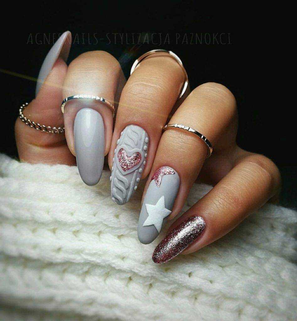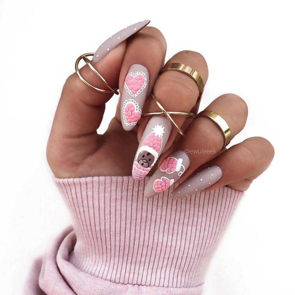 Что если вязаный узор в маникюре сделать маленькими сердечками? В подобном дизайне свитера ногти смотрятся очень красиво и нежно. Как вариант вязки сердечками нейл-дизайн хорошо смотрится в матовом однотонном маникюре.