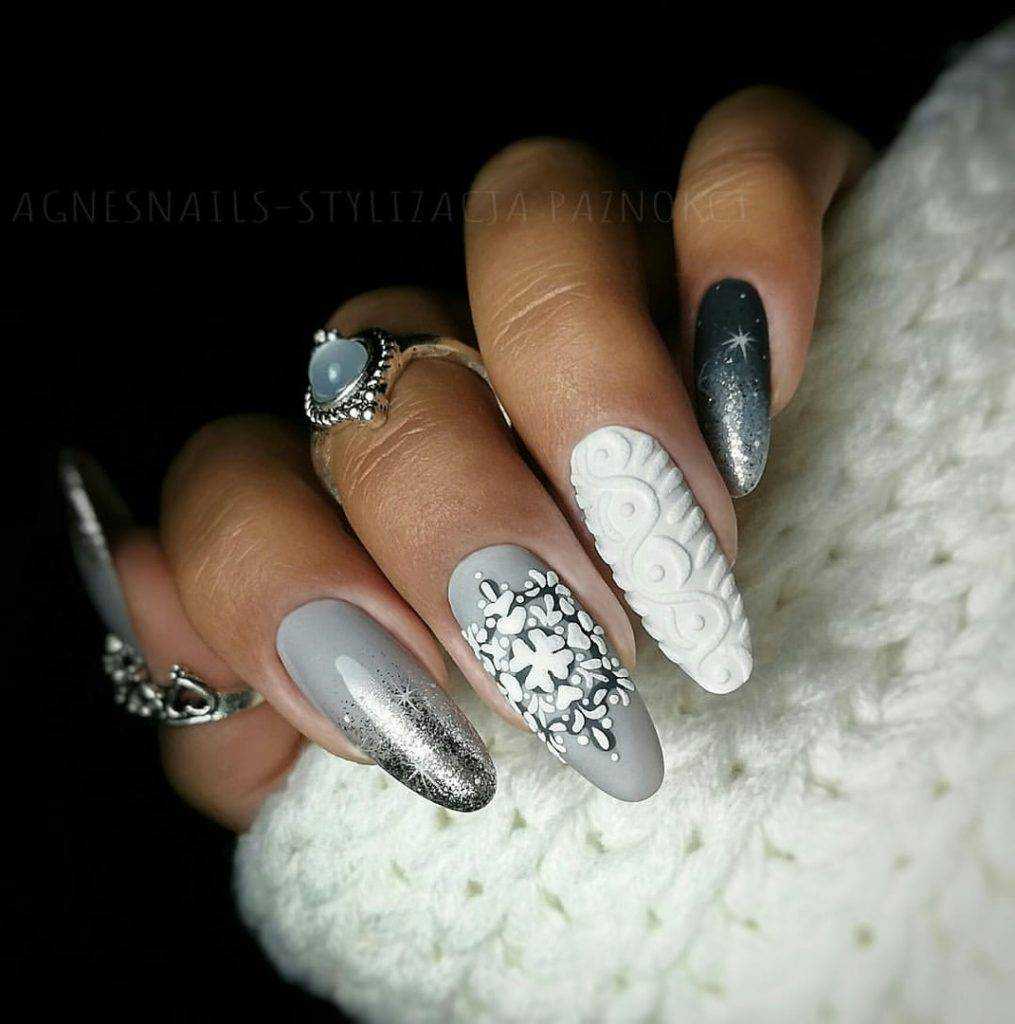 Красивые снежинки и вязка на ногтях будут гармонично смотреться как в комбинированных вариантах, так и в паре на одном ноготке.