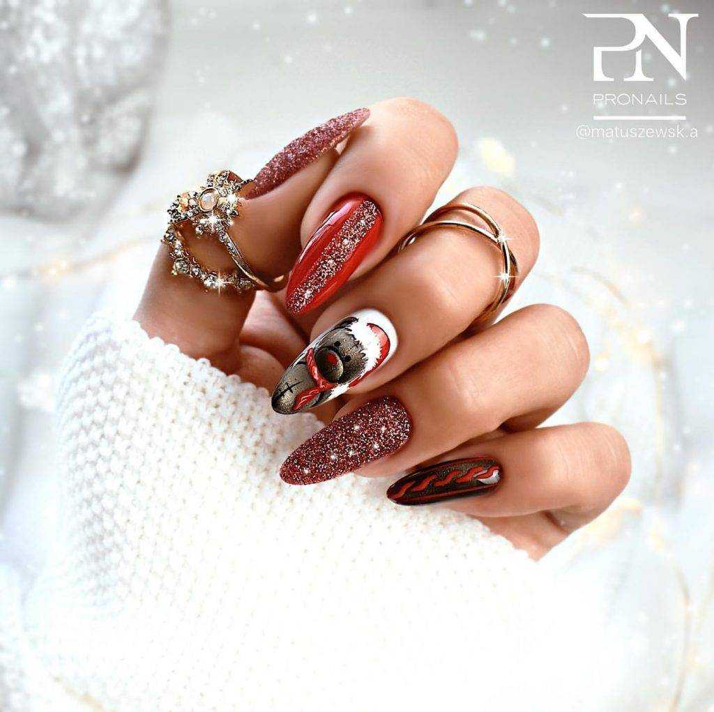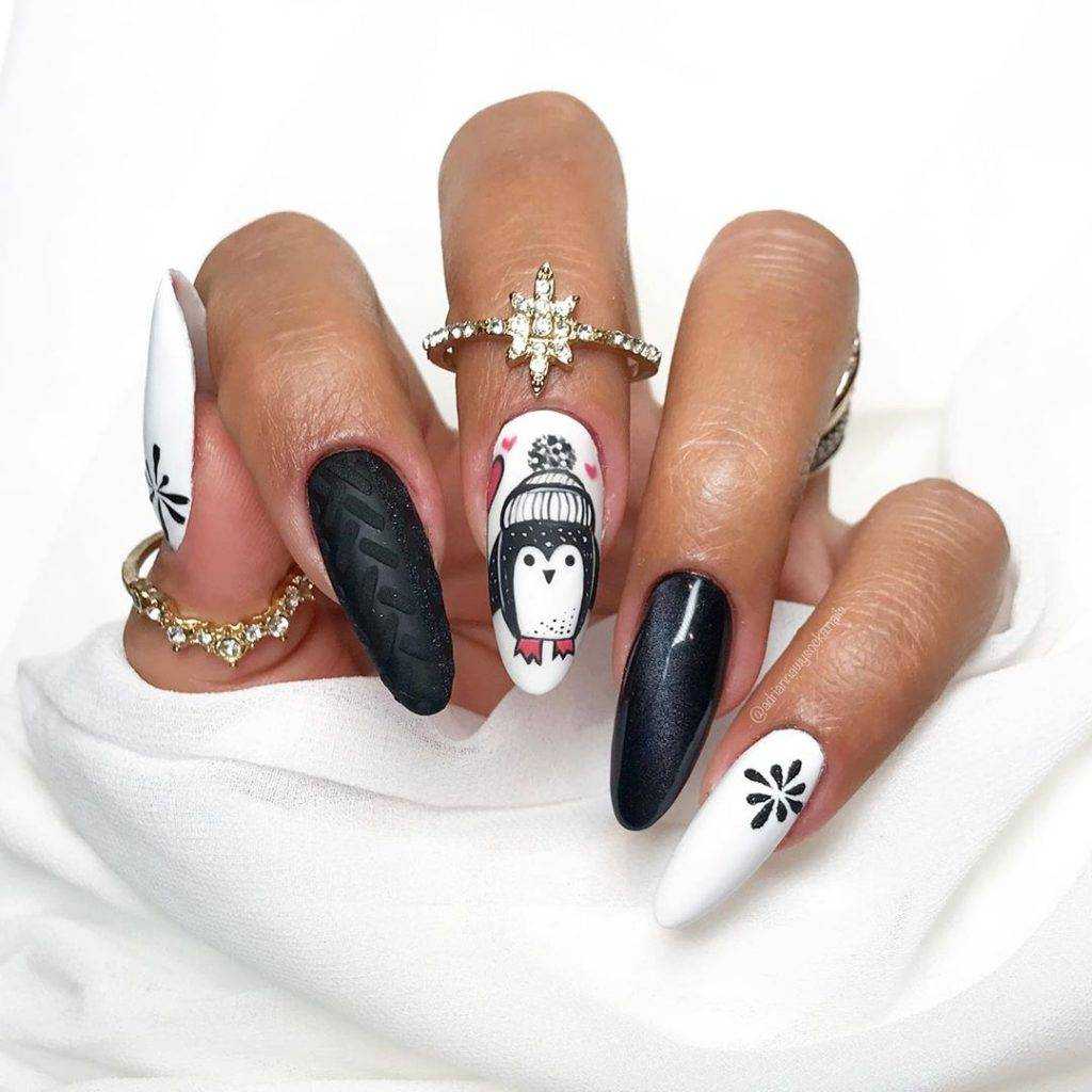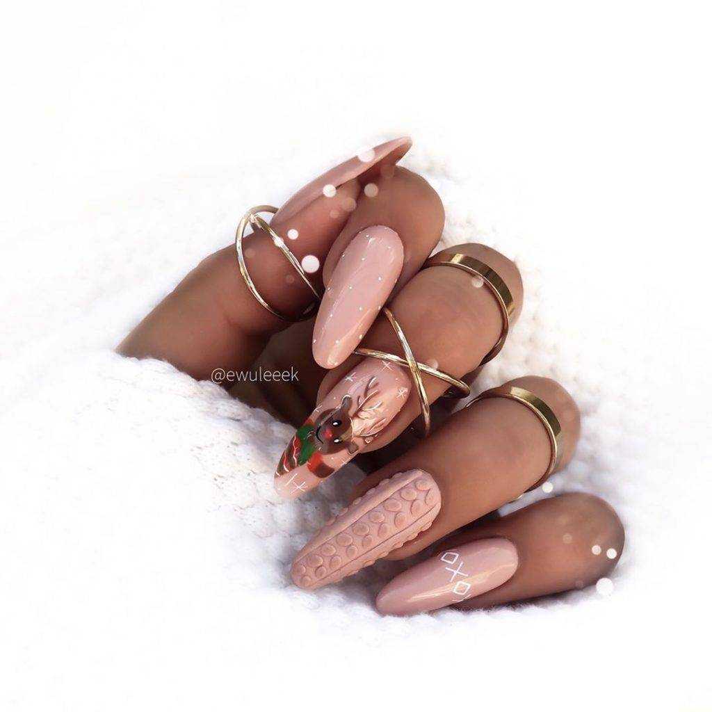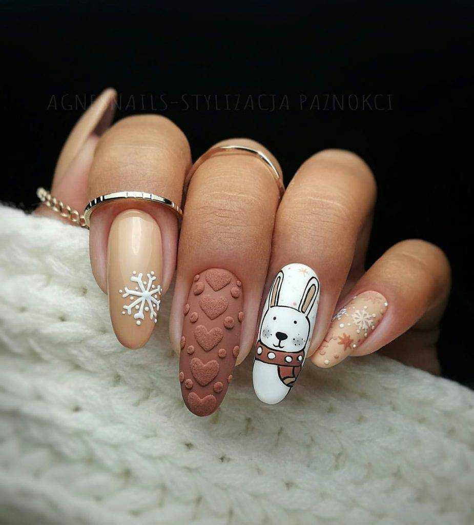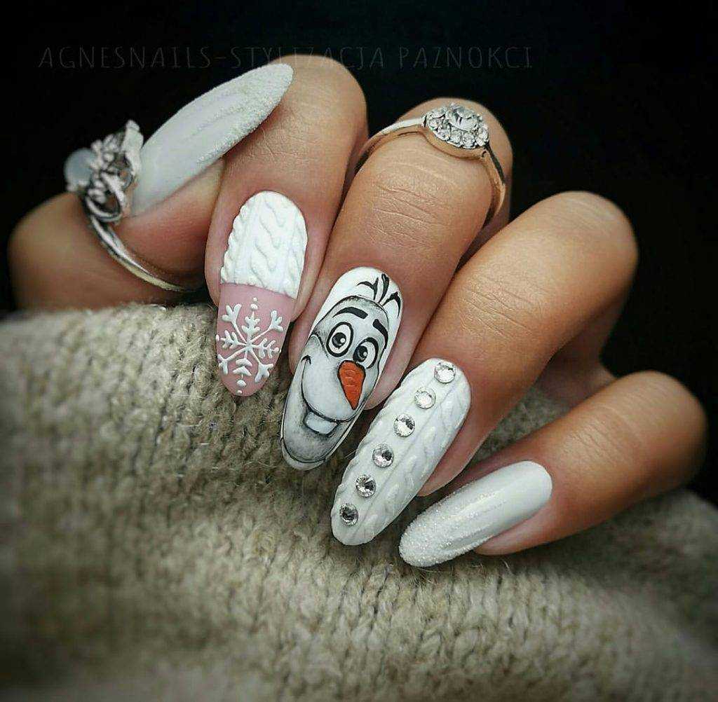 Большой популярностью пользуется снеговик Олаф, который в паре с вязаными ногтями смотрится потрясающе. В зимнем маникюре 2021-2022 вязаный дизайн с изображениями животных остается одним из самых трендовых.