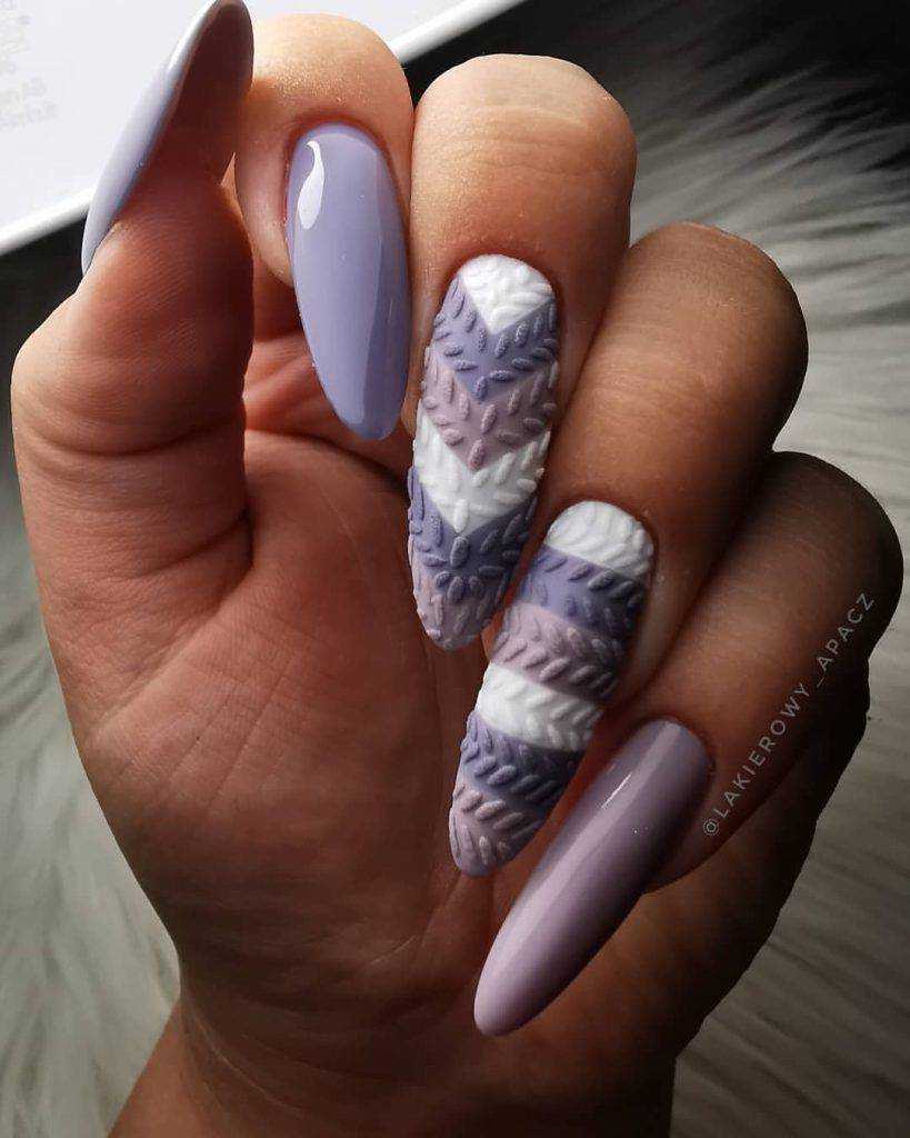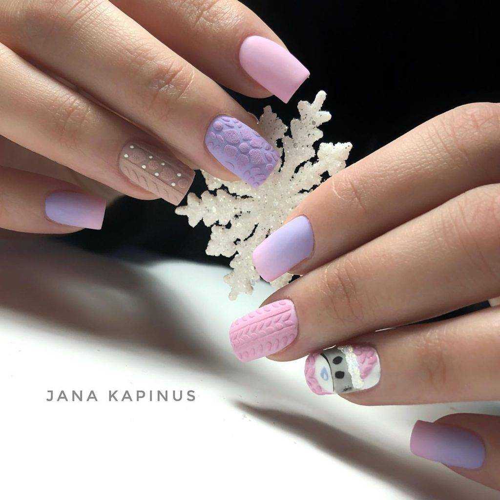 Конечно, большинство вариантов пастельного вязаного маникюра представлены матовым бархатным узором. Даже в минималистическом стиле, как например светло-серый или лавандовый маникюр с акцентным вязаным дизайном на одном ноготке будет выглядеть симпатично и очаровательно.