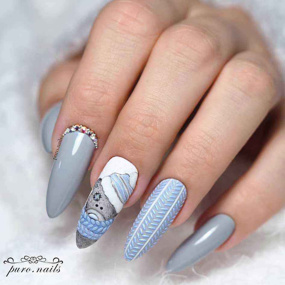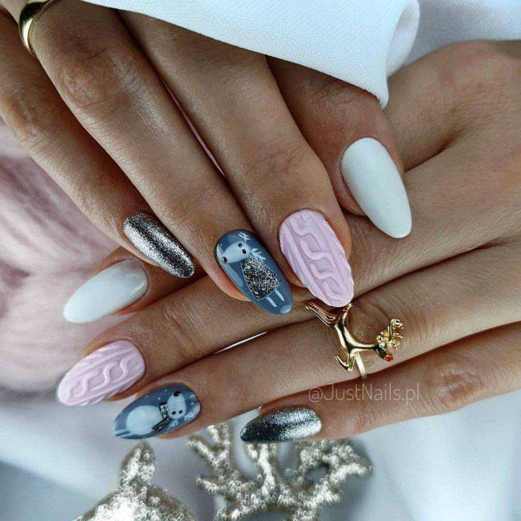 На одном ноготке вязка свитера, а на другом милый рисунок забавного мишки, пингвина или оленя в шапочке или с шарфиком – подобный вариант стильного вязаного маникюра поднимет настроение не только своей хозяйке. Комбинации красочных рисунков в виде мультяшных персонажей или зверушек с вязаным эффектом могут быть самыми разнообразными.