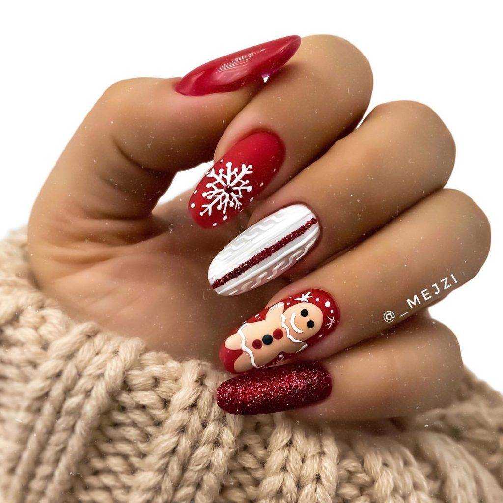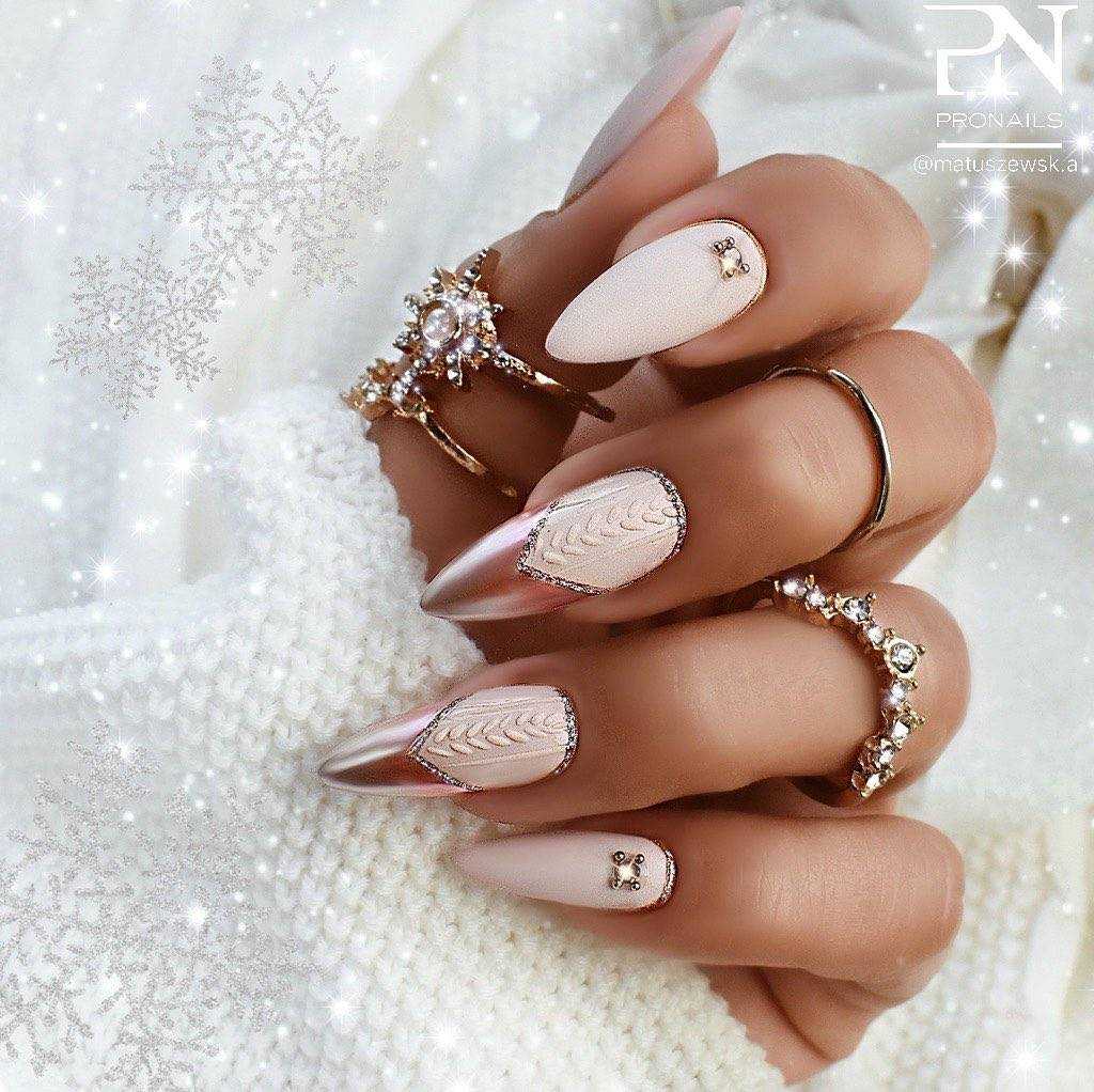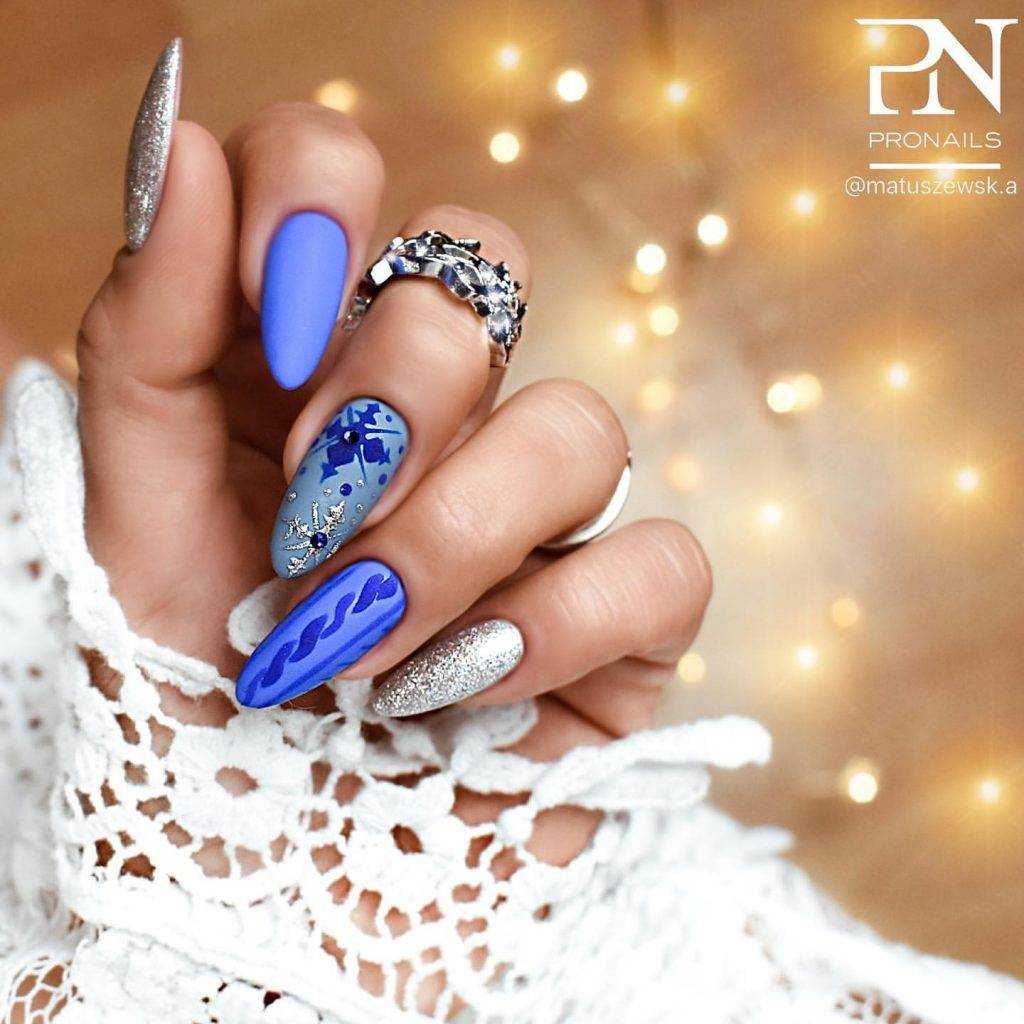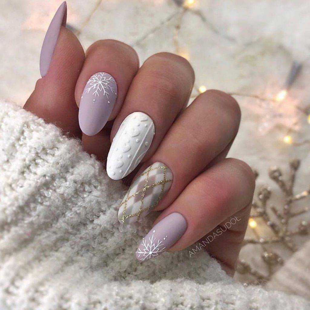 Какой зимний маникюр 2021-2022 и без красивых снежинок, которые тоже могут стать роскошной идеей для дизайна в стиле вязаного свитера. Снежинки можно нарисовать разными способами, использовать слайдеры или стемпинг или выложить стразами.