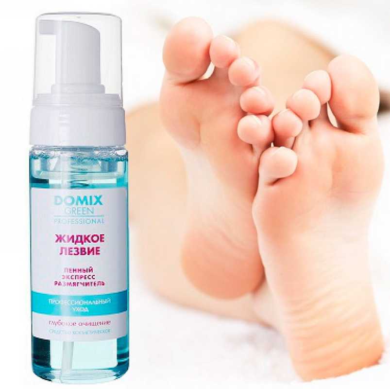 На сегодняшний день широко востребованы профессиональные средства для педикюра, изготовленные на основе фруктовой кислоты. Одним из популярных и доступных средств является такой продукт, как жидкое лезвие Domix Green Professional на глицериновой основе. Представляет собой пенный размягчитель для кожи стоп. Средства Домикс часто применяют мастера в салонах красоты. Флакон объемом 200 мл в среднем можно приобрести за 650 рублей.