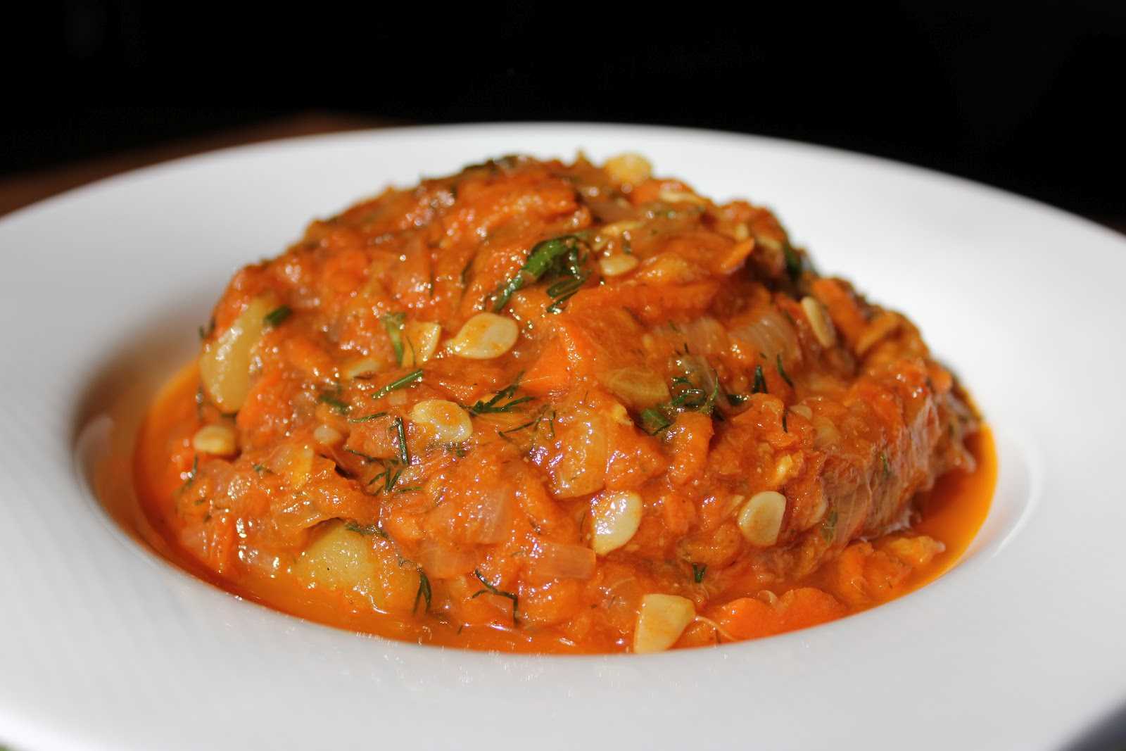 Пикантная закуска с тонким вкусом и выраженным ароматом. Добавление томатпасты придёт ей характерную кислинку, а чесночные зубчики и чили — остроту в послевкусии. Закуска универсальная: подходит для ежедневного и праздничного стола. Торжественную сервировку особенно подчеркивает яркость лёгкой заготовки с калорийностью в 72 ккал на 100 г продукта. Содержание БЖУ