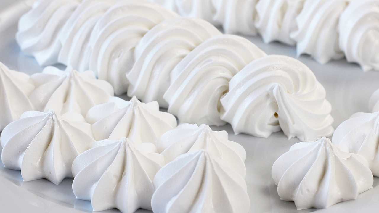 Для приготовления крема понадобятся охлажденные свежие яичные белки, сахар, несколько капель лимонного сока и мощный миксер.