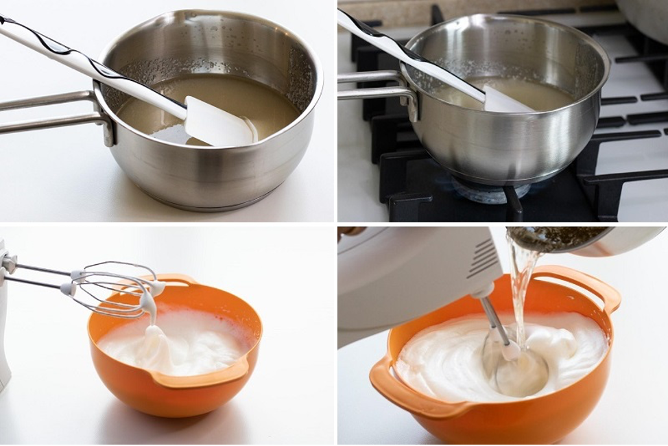 Прежде нужно уварить шербет при 115 °C до консистенции мягкого шарика, параллельно вспушить белки до многократного увеличения в объеме. Не выключая венчиков, влить горячую, но не кипящую вязкую жидкость с ванилином, продолжить растирать до твердых пиков.