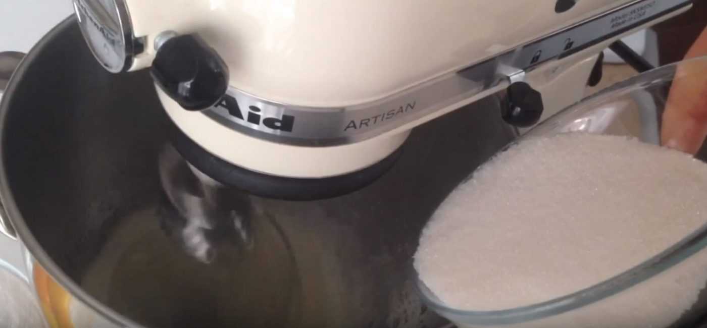 - Взбиваем 4 яйца на протяжении минуты, после чего постепенно начинаем всыпать 120 грамм сахара.