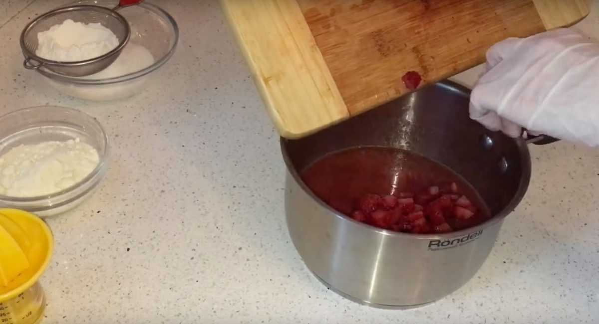 - Часть клубники нарезают кружочками. Несколько целых ягод оставляют для украшения.