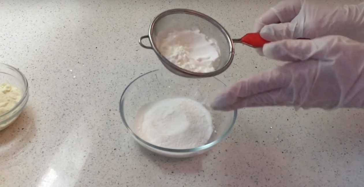 - Выложить две столовые ложки белкового крема. Перемешать массу так, чтобы не осталось мучных комочков.