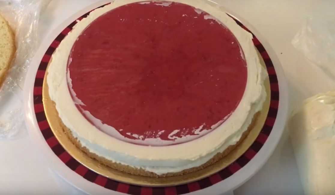 - На каждый корж намазывают сливочный крем и кладут нарезанную клубнику. Верх торта украшают цельными ягодами и заливают приготовленным желе из пакетика.