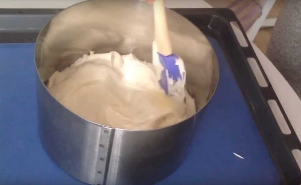3. В форму, диаметром 26 сантиметров, выстелить пергамент. Вылить полученное тесто и равномерно распределить ложкой.