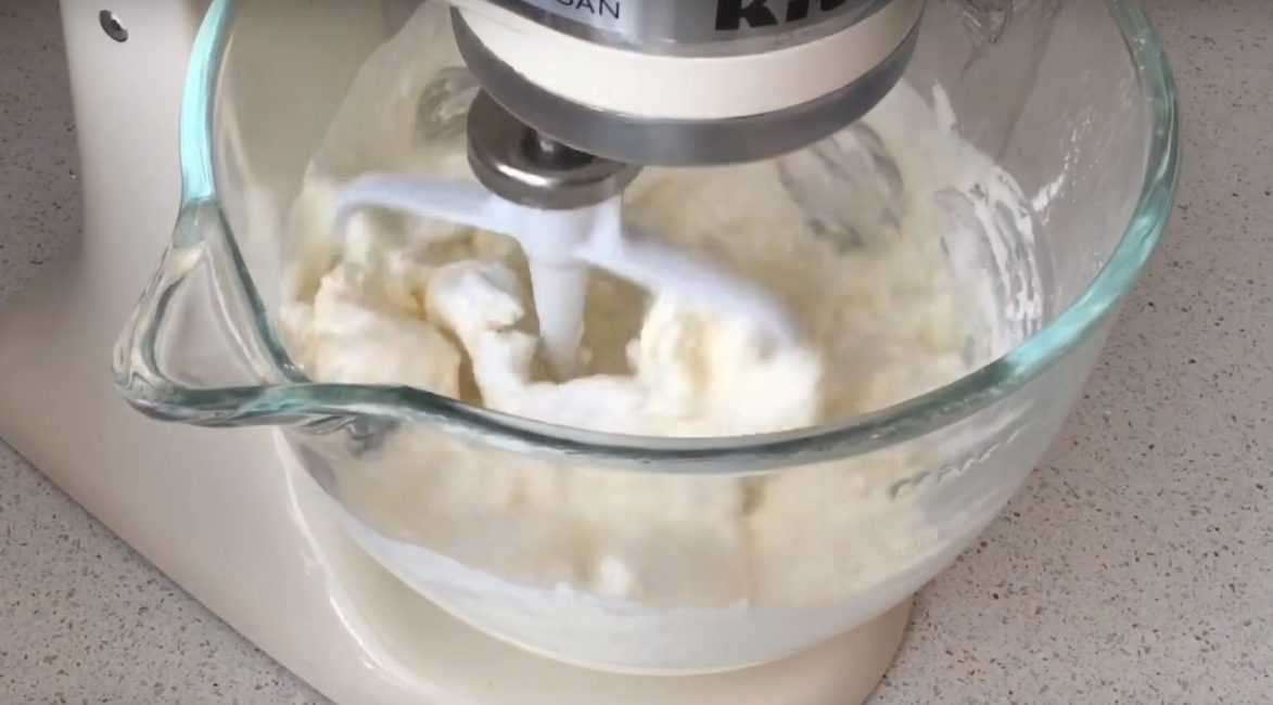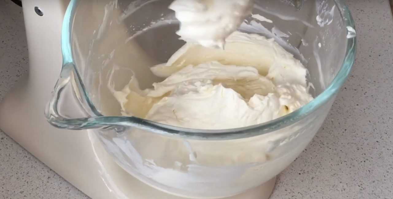 - Затем сюда же добавляем маскарпоне, сахарную пудру и ванильную эссенцию. Все взбиваем до состояния пышного густого крема сначала на низкой, потом на высокой скорости.