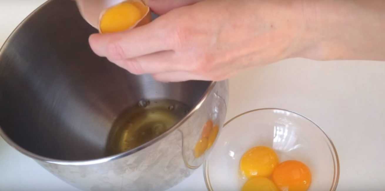 1. Яйца достать из холодильника за пару часов до приготовления. К моменту взбивания они уже должны быть комнатной температуры. Взбить их в глубокой миске вместе с сахарным песком. Делайте это миксером или венчиком, около 5 минут и более.