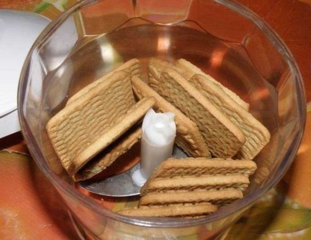 Превращаем печенье в крошку с помощью скалки или блендера.