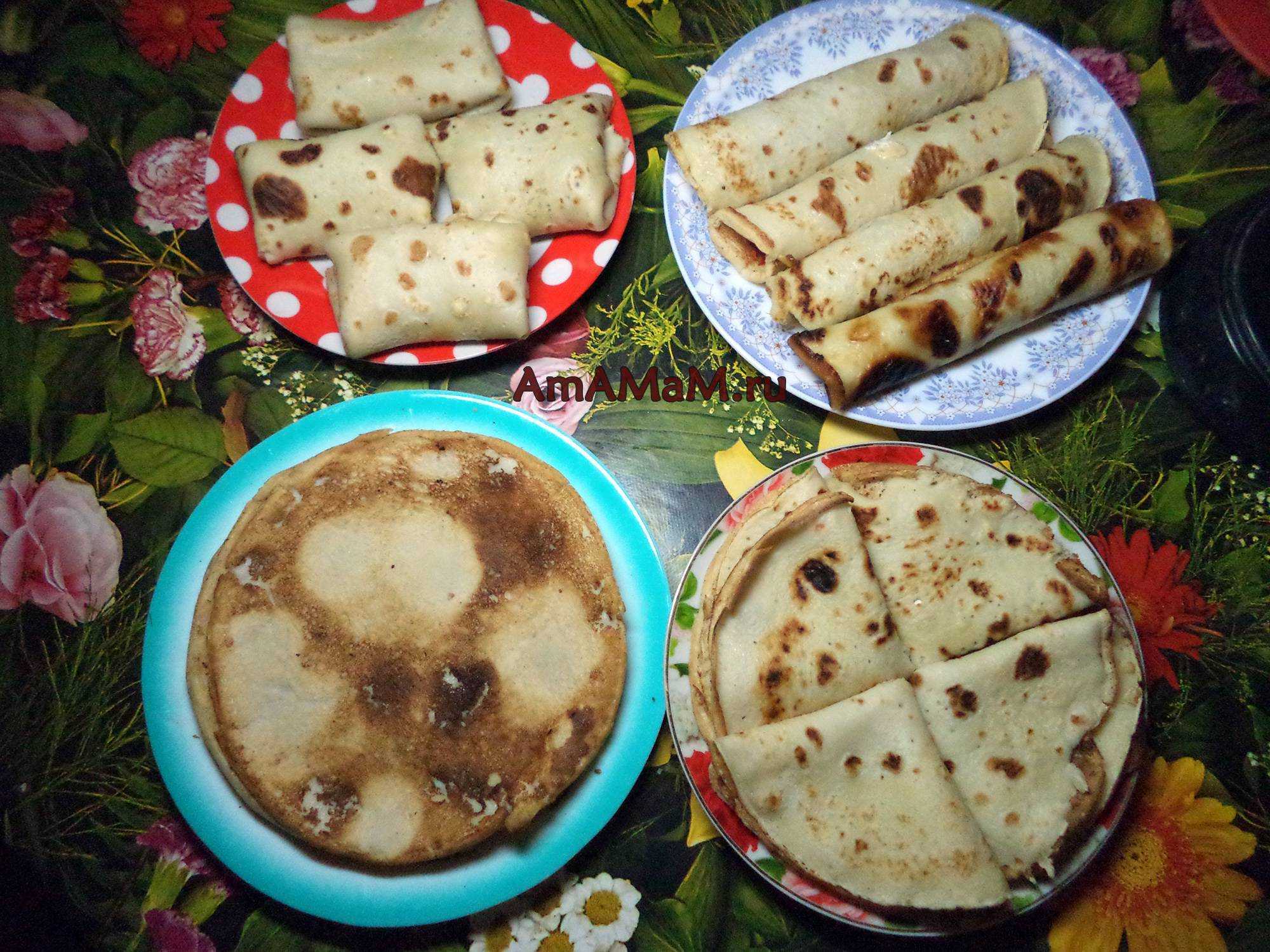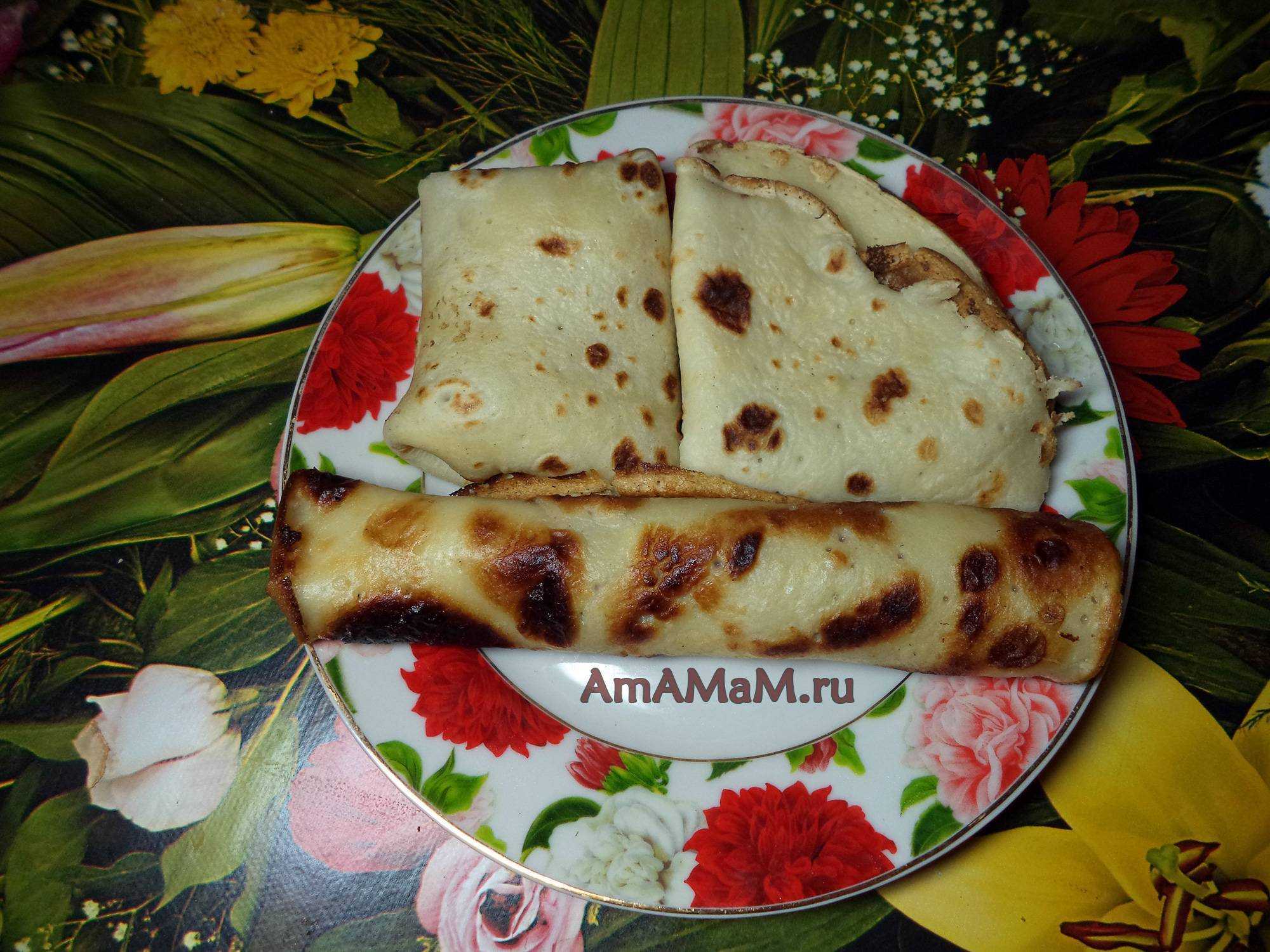 - Разогретую сковороду смазываем маслом, наливаем тесто тонким слоем. Когда края подрумянятся, то переворачиваем и обжариваем с другой стороны;