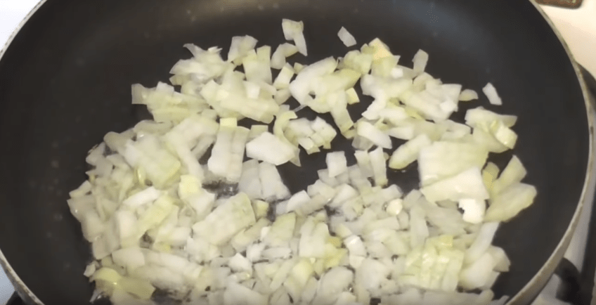 3. Теперь готовим начинку. Для этого лук нарезаем мелкими кубиками и обжариваем на среднем огне 5-7 минут до золотистого цвета.