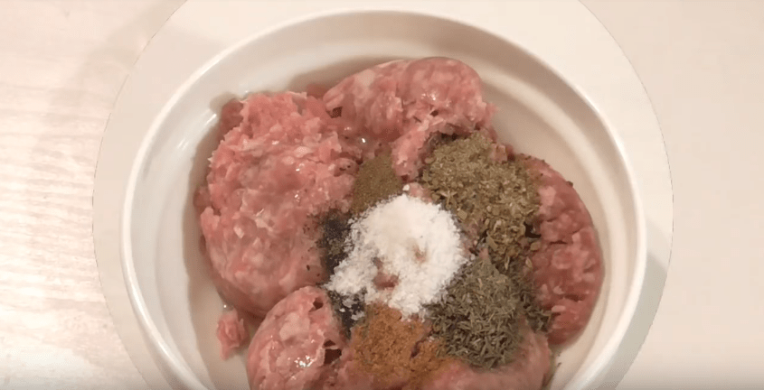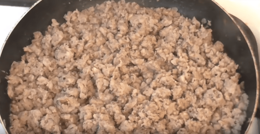 4. Фарш, свежий или размороженный, смешиваем со специями и солью и добавляем его к луку. Обжариваем его на среднем огне, периодически помешивая до полной готовности.