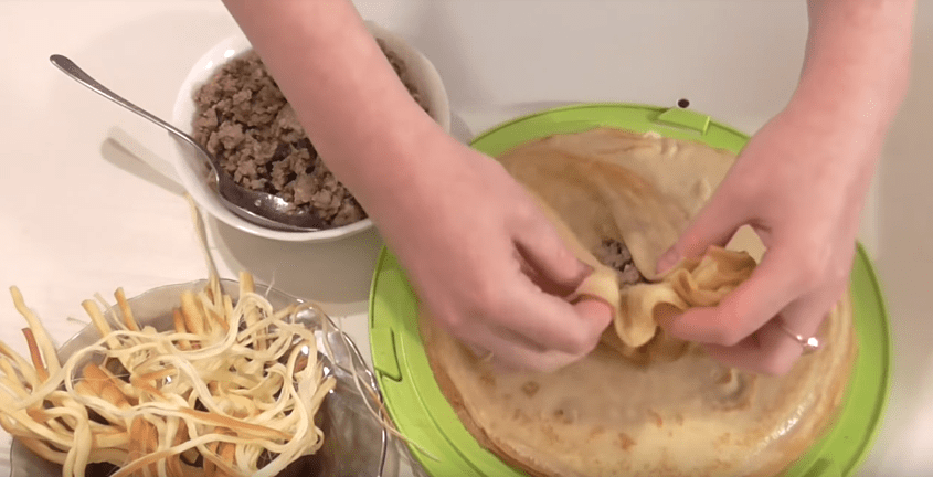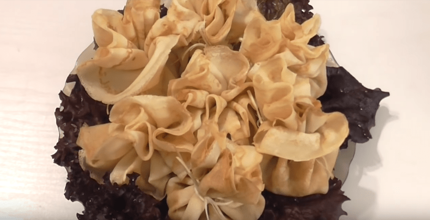 И начнем с одного из самых оригинальных- блинный мешочек. Плюс его в очень оригинальной подаче, которая будет актуально смотреться на праздничном столе.