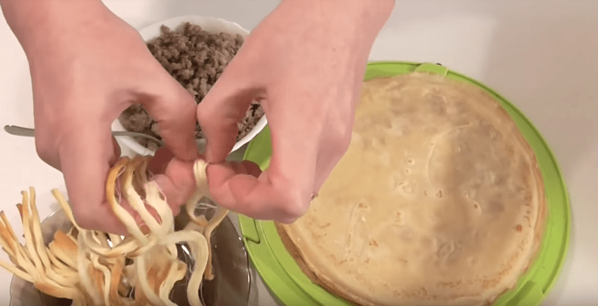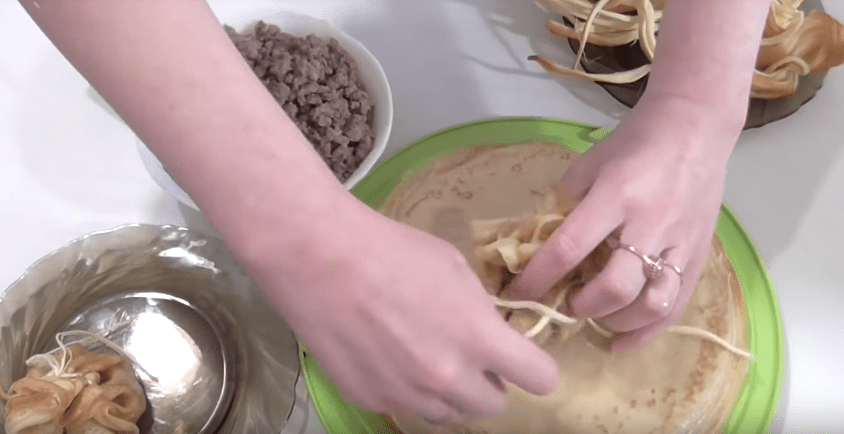 5. Теперь остается только собрать подготовленные элементы. Сначала берем сыр-косичку и аккуратно разбираем ее на волокна. Ими мы будем завязывать блинные мешочки.