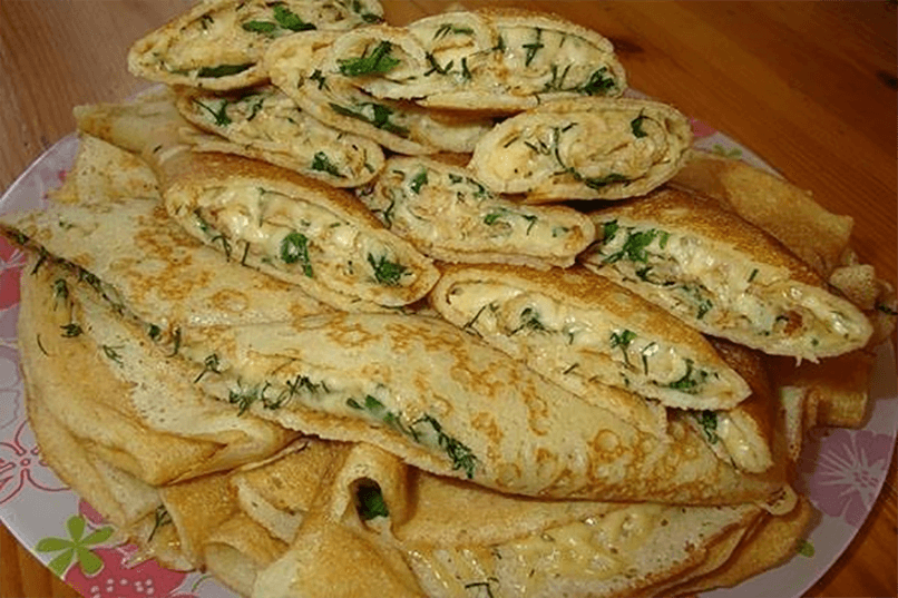 Фаршированные блины на молоке со свининой, яйцами и зеленью