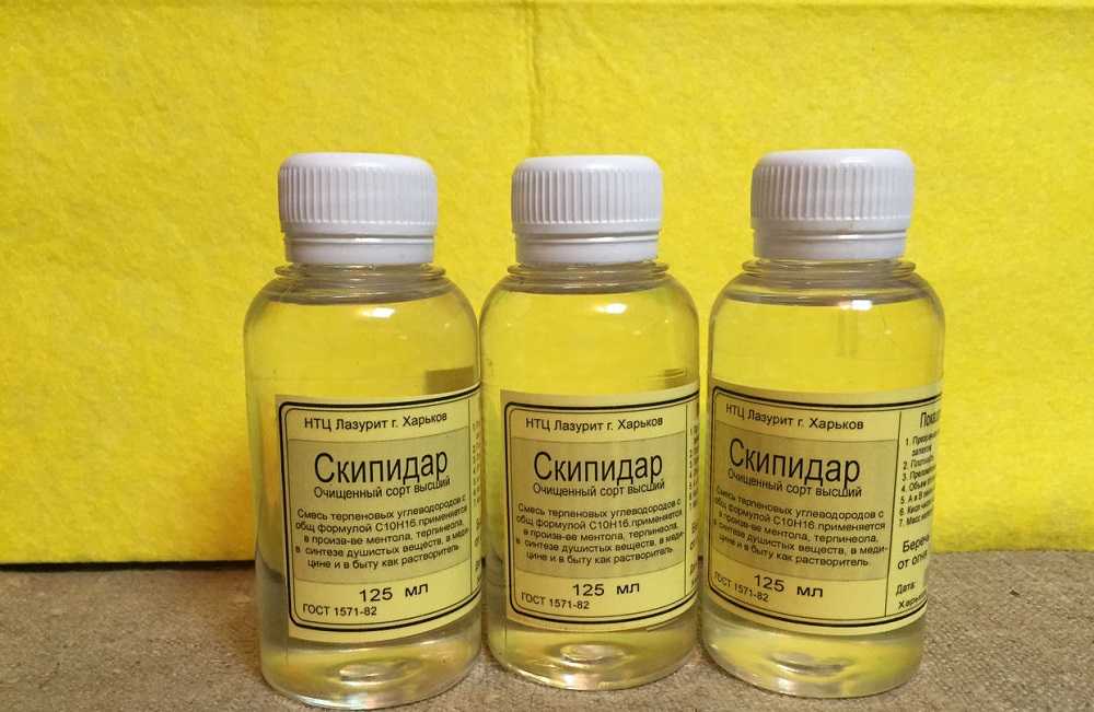 - Скипидар и нашатырный спирт. Из этих ингредиентов готовят раствор в пропорции 1:1, которым тщательно протирают пятно. Затем одежду оставляют на длительное время (несколько часов), после чего приступают к обычной стирке с порошком.