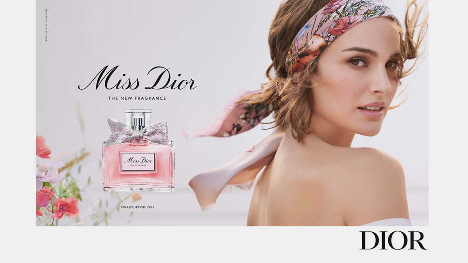 Key visual парфюмерной воды Dior. Здесь три композиционных центра: портрет актрисы, продукт с названием над ним, логотип компанииИзображение: дизайн агентства Leap