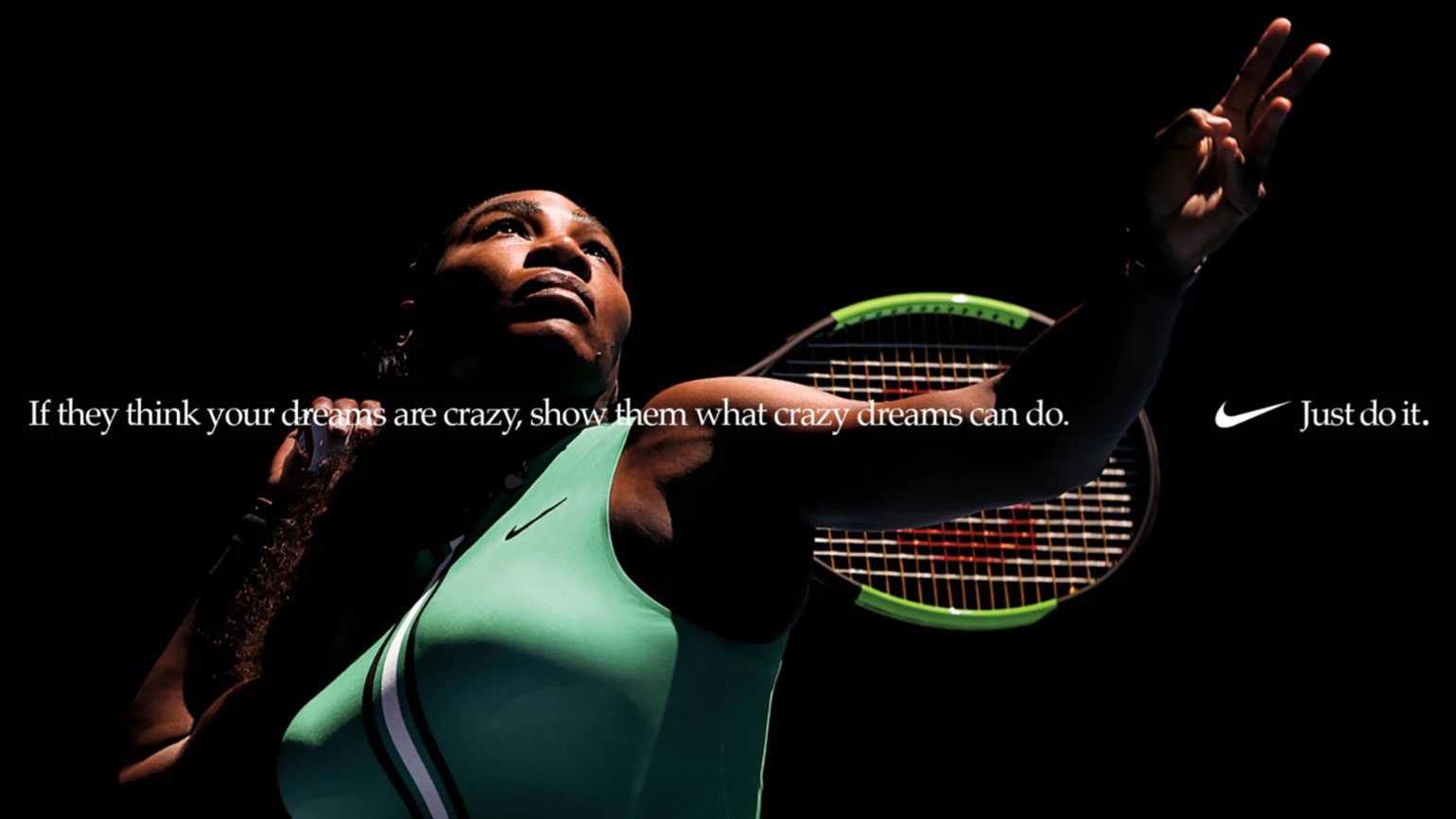 Рекламный плакат Nike. Три ключевых элемента композиции — лицо, ракета и грудь спортсменки образуют треугольникИзображение: Nike / дизайн компании Wieden Kennedy