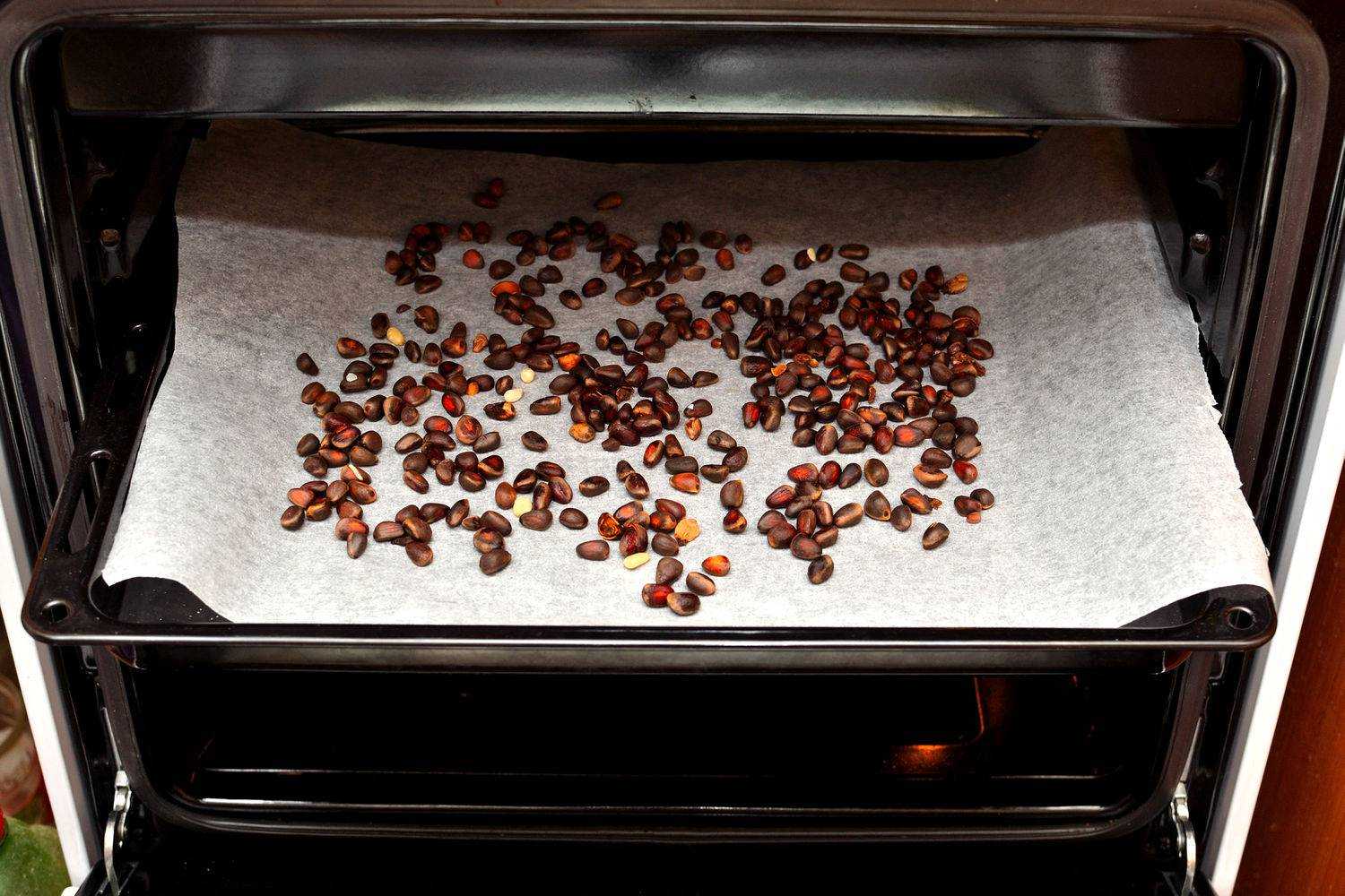Еще один способ быстрого очищения кедровых орешков: сначала прогреть их в духовке, а затем сразу поместить в холодную воду.