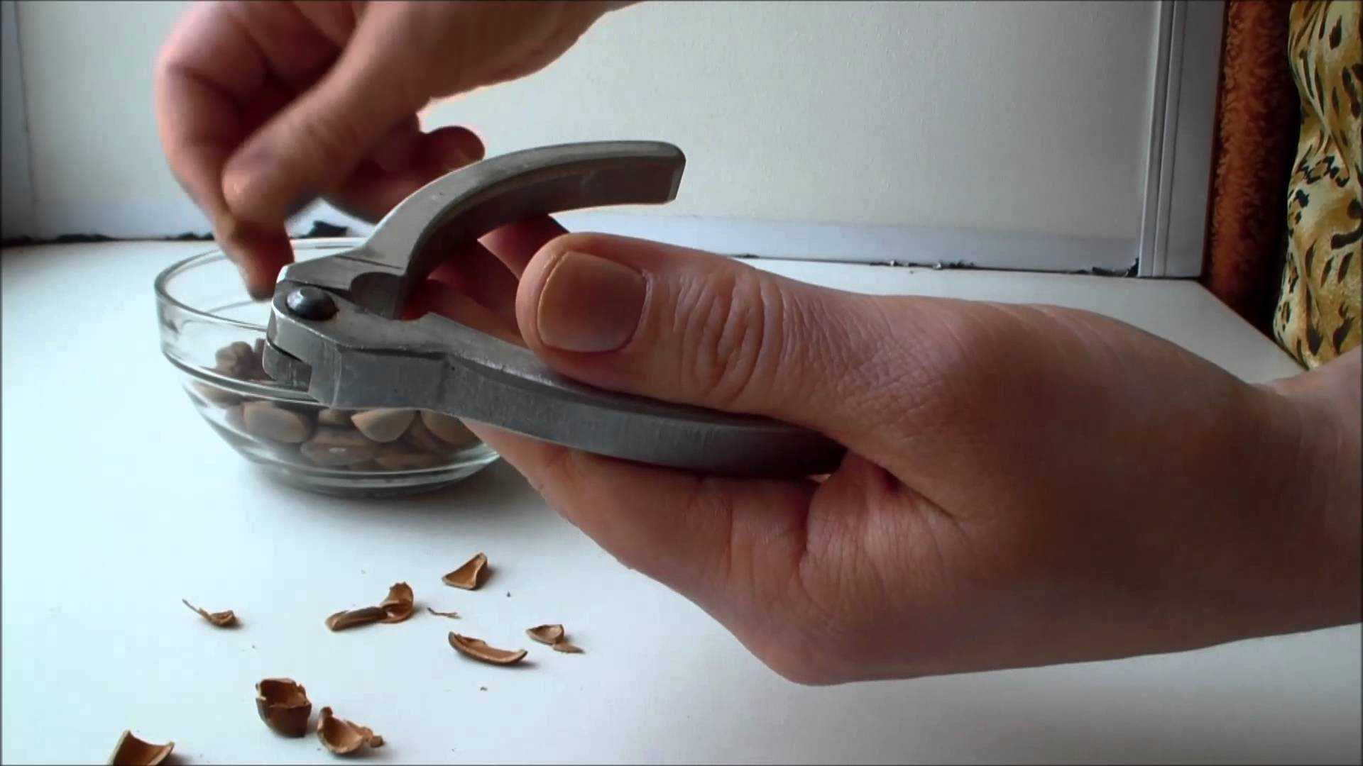 Как быстро почистить грецкие орехи — вопрос, с которм часто сталкиваются потребители, поэтому в продаже можно приобрести специальный орехокол. Он сделан из прочного металла и похож на щипцы, его принцип действия очень простой: орех зажимается между двумя рифлеными пластинками, руками нужно надавить на ручки. Здесь тоже нужно рассчитать силу, сдавливание должно быть неторопливым, чтобы получить в итоге целые ядра. По такому принципу расколоть орех можно:
