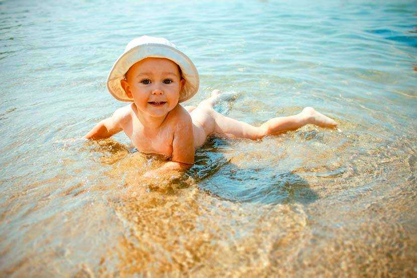 Начинать походы на пляж нужно постепенно. Изначально выходите на полчаса, при этом под прямыми солнечными лучами не проводите больше 5 минут. Затем постепенно увеличивайте время. Не снимайте с ребенка головной убор даже в тени.