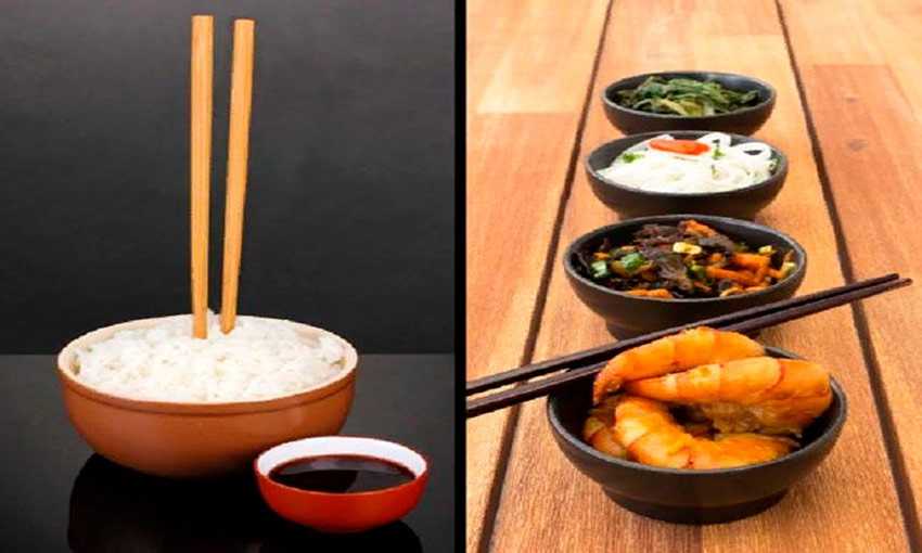 - Палочки не кладут в тарелку после окончания трапезы, запрещаться вставлять их в вертикальное положение в еду.