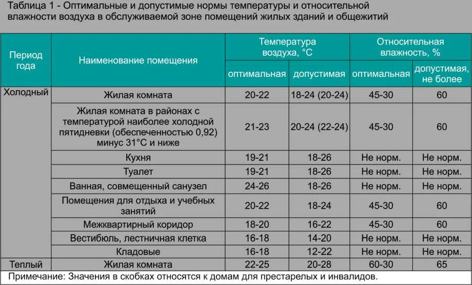 Таблица нормативных значений температуры и влажности воздуха в жилых помещениях