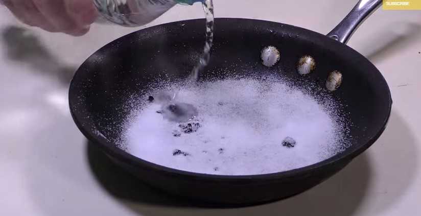 - Полученную жидкость вылить на сковороду так, чтобы она покрывала нагар полностью, если указанных пропорций не хватает, увеличьте количество взятых веществ.