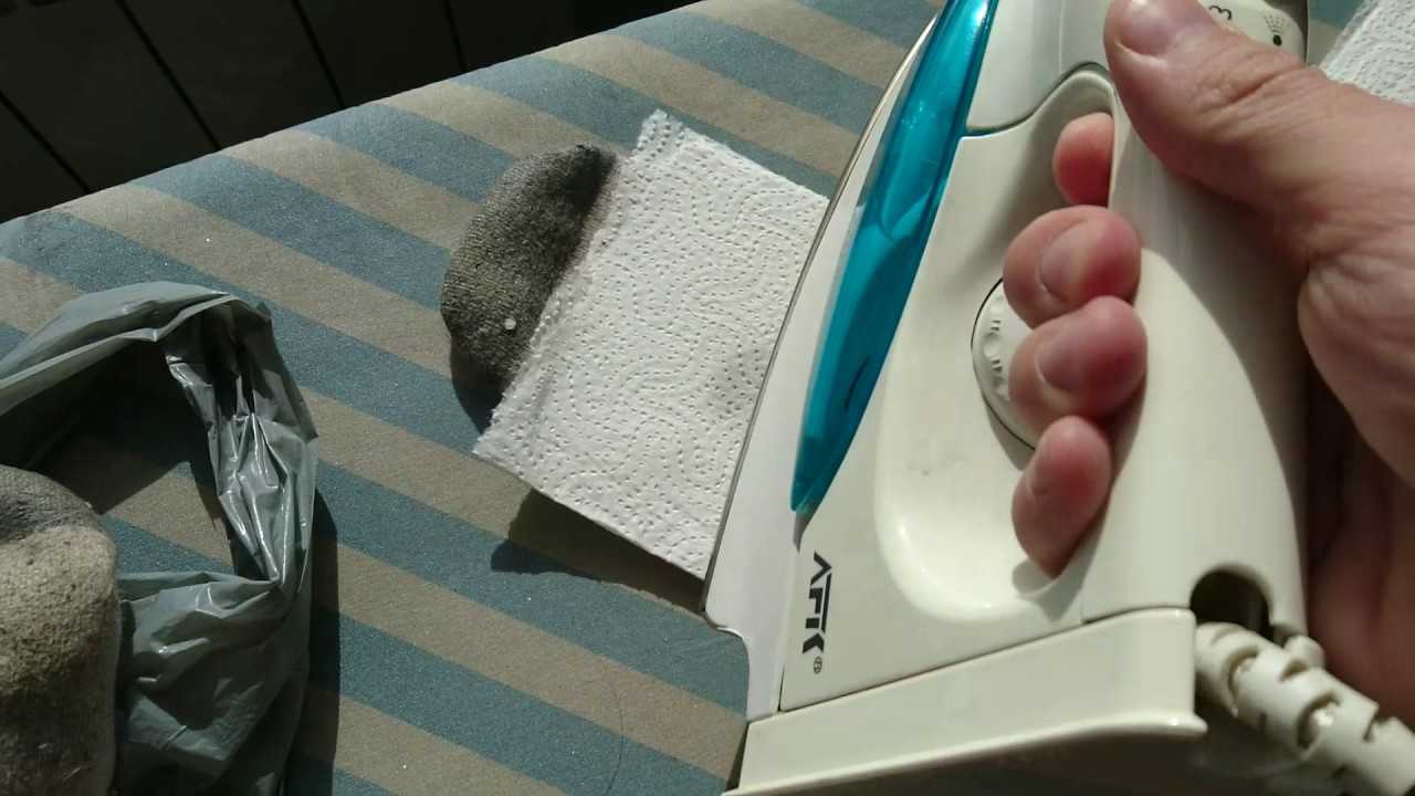 Затем накрыть свечную кляксу салфеткой или бумажным полотенцем, приложить к подошве разогретого утюга. Держать его лучше на весу, почти не касаясь загрязнения
