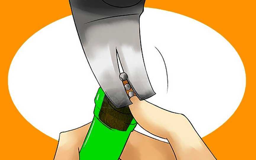 - Наклоните бутылку, резко взмахните саблей, чтобы наискось рассечь горлышко.