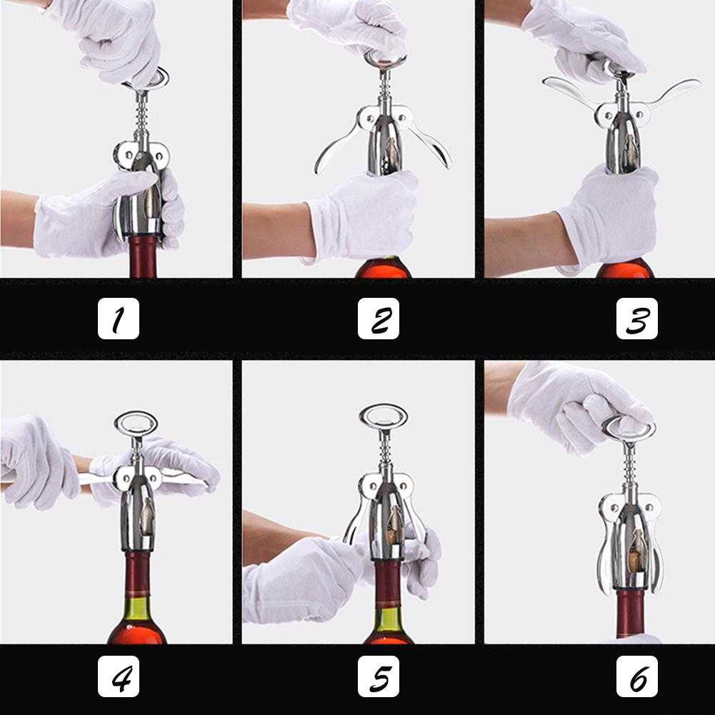 Конструкция напоминает бабочку, расправляющую крылья. По центру расположен винт, а по бокам — два рычага. Чтобы открыть бутылку, одной рукой направляем спираль по центру пробки и надавливаем, второй рукой начинаем закручивать винт до основания. В процессе вкручивания рычаги по бокам начнут подниматься. Когда они достигнут горизонтального положения, ставим ровно бутылку и обеими руками одновременно нажимаем на рычаги.