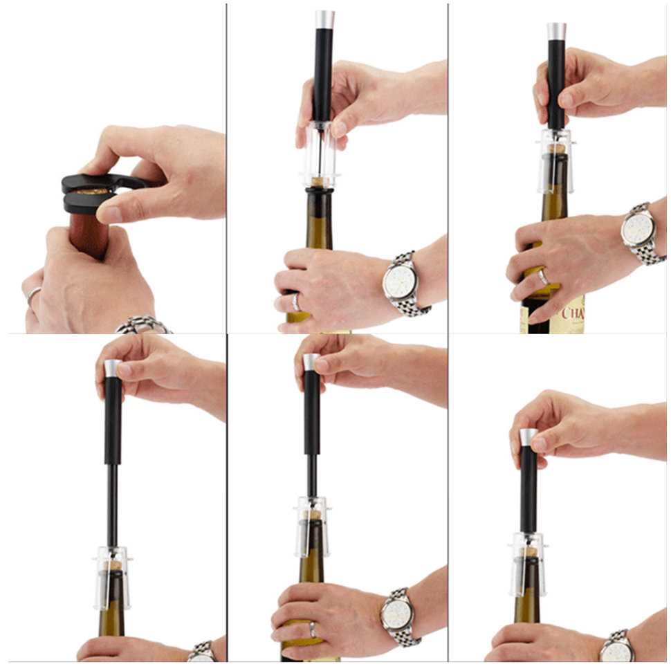 В России такой вид штопора не всегда можно увидеть, поскольку он дорогой. Видом напоминает шприц с иглой. Чтобы открыть вино, вставляем стержень в пробку так, чтобы он вышел насквозь. Затем накачиваем воздух самостоятельно или при помощи кнопки. Суть процесса заключается во впуске кислорода в бутылку, который под давлением выталкивает пробку наружу. Существуют модели с ручной или электрической подкачкой.