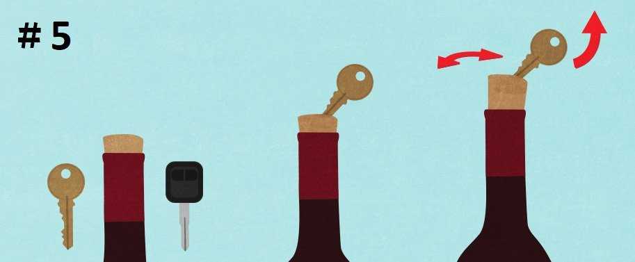В особом случае для этого пригодится даже фломастер, ручка или дверной ключ. Есть исключения: если горлышко бутылки становится всё уже и уже, таким способом лучше не пользоваться. Но если вы заметили это слишком поздно, и пробка уже успела застрять, то всё ещё можно спасти, нужно лишь расковырять её острым предметом — пилкой для ногтей, канцелярским ножичком, маникюрными ножницами, спицей. В этом есть свои минусы — крошечные кусочки пробки попадут в вино, и придётся либо наливать напиток через чайное ситечко, либо вылавливать крошки из бокала.