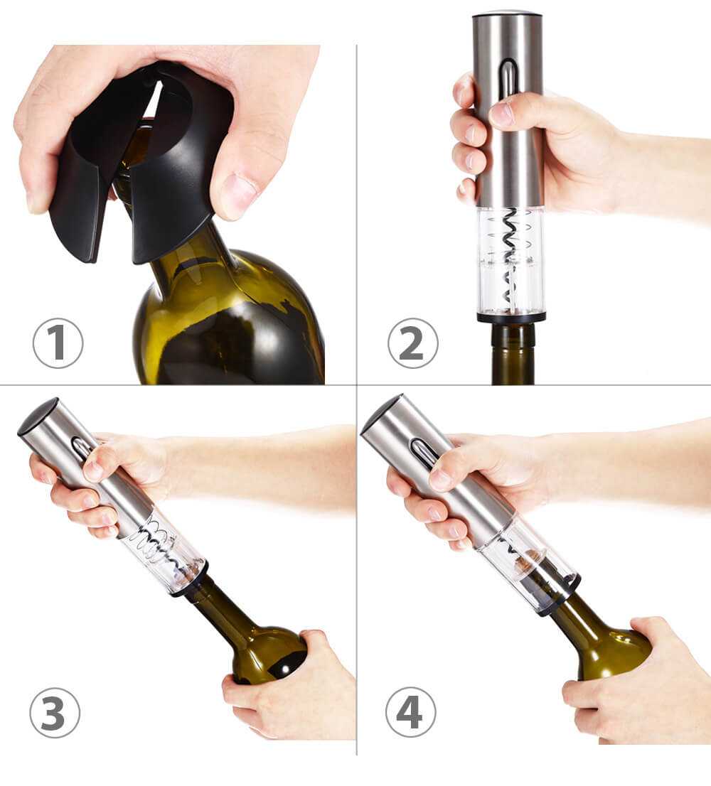 Чтобы снять верхний слой фольги, кладем штопор на верхнюю часть горлышка и с нажатием прокручиваем его на 90 градусов. Затем кладем механизм ровно по вертикали в центр пробки и жмем соответствующую кнопку. На каждом штопоре может быть разная индикация, но в основном кнопка захвата пробки обозначается символом вниз. После завершения впуска нажимаем на противоположную кнопку вверх и механизм автоматически выдавит закупорку наружу. Из недостатков можно выделить большое количество некачественных подделок на рынке.