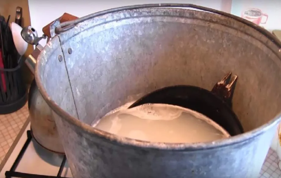 Приготовить раствор по приведенным выше пропорциям. Найти посуду, которая может стоять на огне, но по объему является большей, чем та, что нужно очистить. Можно использовать железное ведро, таз или кастрюлю большего размера, в которой нужно довести воду до кипения.
