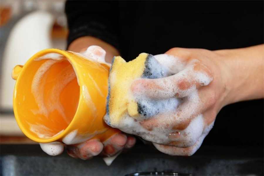 Правильно подбирайте инструменты для мытья посуды руками. Оптимальный вариант – кухонная губка. Она прекрасно отмывает загрязнения и, в отличие от обычной тряпки, сама быстро очищается от остатков жира и пищи. Моющие средства лучше применять только натуральные, народные.