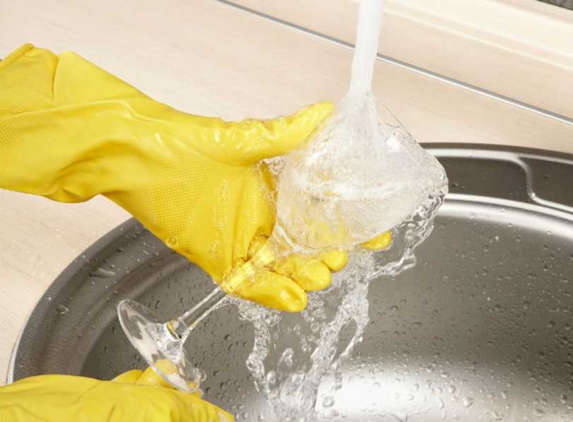 Посуду из стекла следует мыть жидкими средствами, порошки могут поцарапать материал. Температура воды во время процесса не должна резко меняться, это может привести к микро разрывам и трещинам. Как правило, для мытья стекла используют прохладную воду, но при сильном жировом загрязнении можно использовать более горячую.